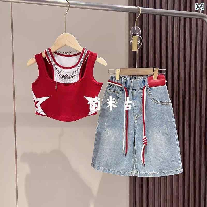 ・カテゴリ: キッズセットアップ・性別: 女の子用・対象年齢: 8歳以上、140cm以上・スタイル: 韓国・セットタイプ: パンツセット・セット内容: 2点セット・主な素材: 綿90%・生地加工: 柔軟加工・厚さ: 薄手・柄: 無地・袖丈: ノースリーブ・パンツ丈: ショート丈・開閉タイプ: プルオーバー・カラー展開: フェイクレイヤードレッドベスト(単品)、デニムハーフパンツ(単品)、フェイクレイヤードレッドベスト+デニムハーフパンツ・対応身長: 120cm、130cm、140cm、150cm、160cm、170cm