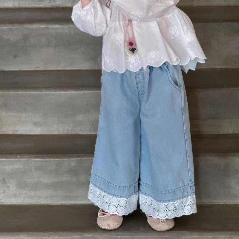 キッズ デニム パンツ 春秋物 ベビー 幼児 レース フリル ワイドレッグ パンツ コットン 73CM 80cm 90cm 100cm 110cm 120cm