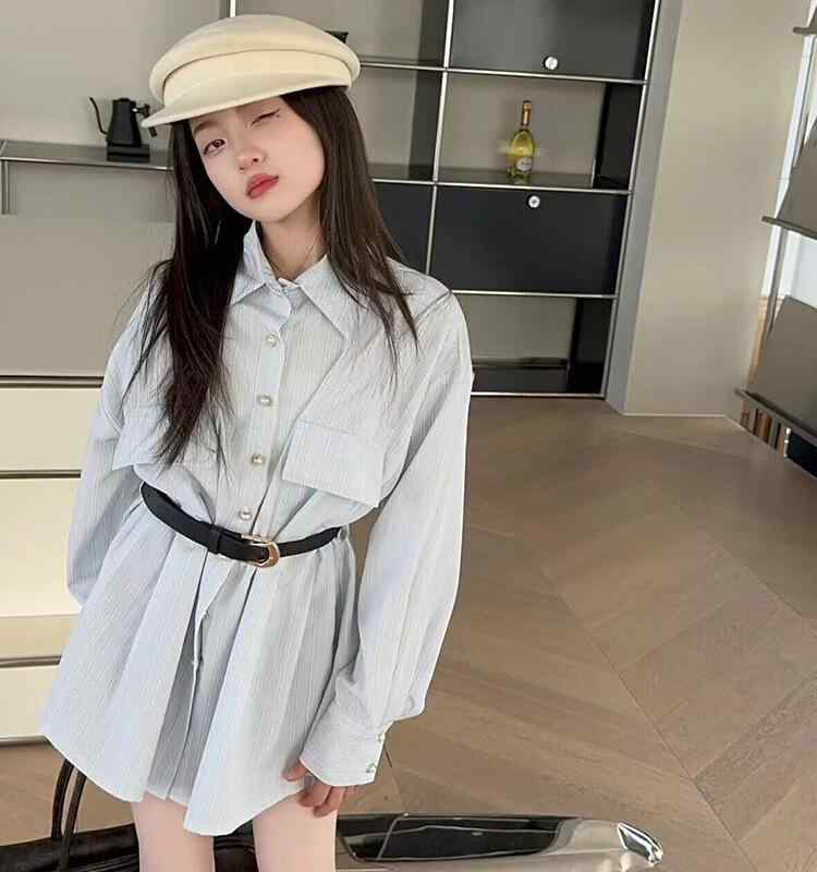 子供 ワンピース 韓国 春秋 女の子 キッズ ジュニア シャツ 襟 ポケット ベルト付き スカート ミニ丈 長袖 シンプル スタイリッシュ かわいい 青