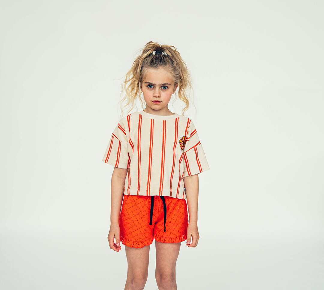 CarlijnQ カーラインク Stripes flame - cropped t-shirt wt embroidery タオル地 パイル地 KIDS キッズ 子供 かわいい ストライプ 半袖 海外ブランド オランダ ヨーロッパ オレンジ ガーリー おしゃれ 春夏秋 100cm 110cm 120cm 130cm 140cm 子供服 女の子 ユニセックス