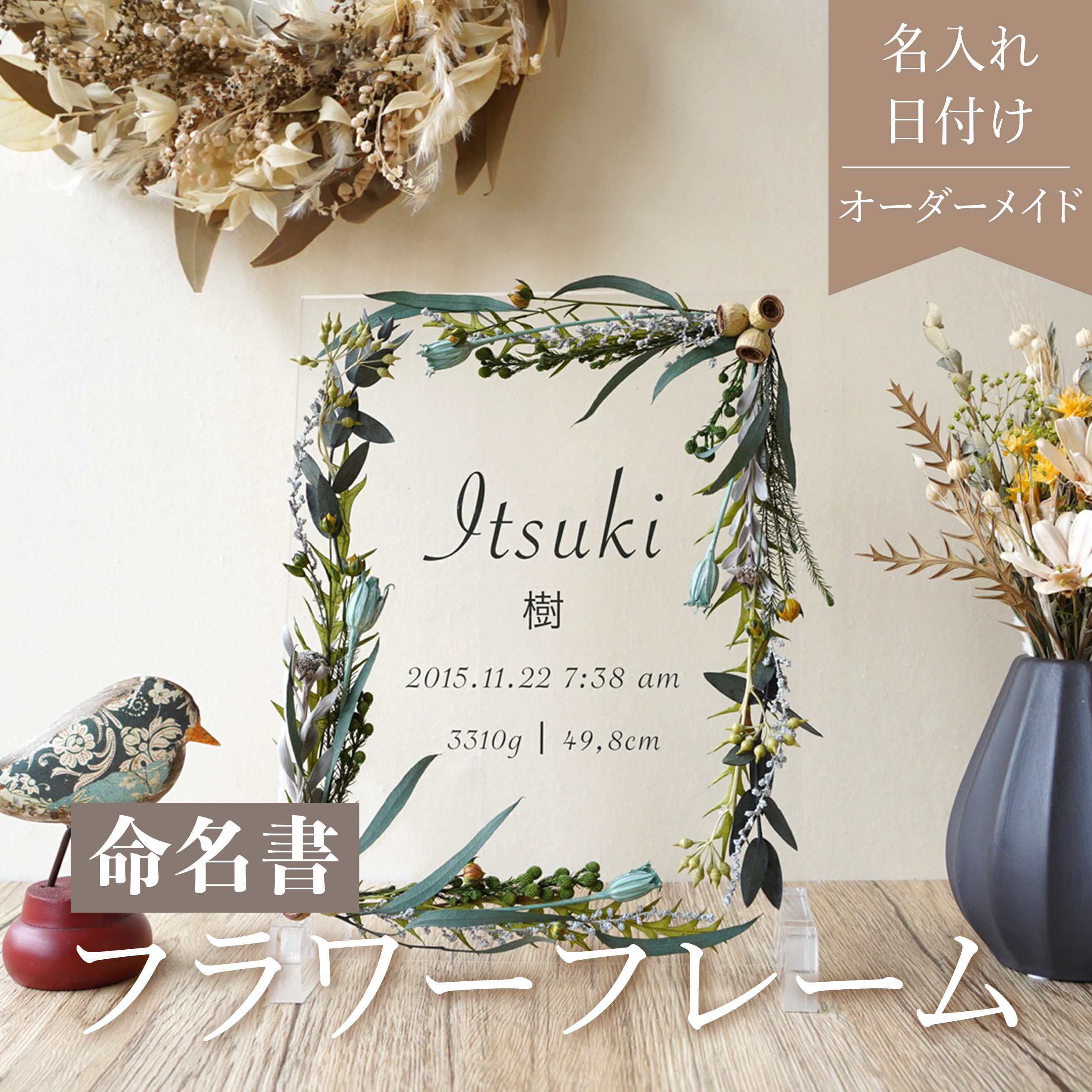 【最大4,000円OFF】【 命名書 flower flame Green i05】命名書 おしゃれ かわいい オーダー オーダーメイド Baby 赤ちゃん 出産祝い ニューボーン プリザーブドフラワー フラワーインテリア 可愛い かわいい かぶらない ハンドメイド作品