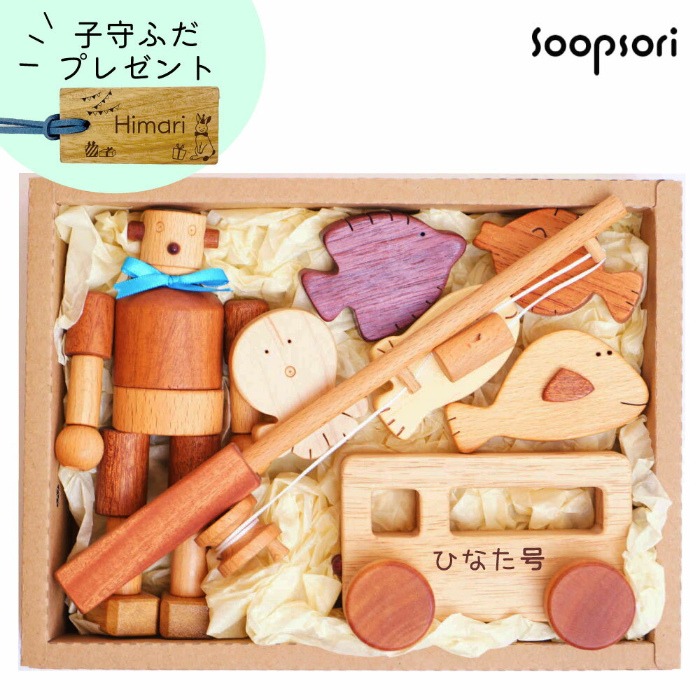 !ご注意!必ずご確認ください 木材は噛み続けると破損の原因となり危険です。スプソリの木のおもちゃは舐めても安心な無塗装ですが、何でも口に入れてしまう時期の赤ちゃんに長時間与えることはおやめください。 歯固めなど0歳向けの噛むことを前提としたおもちゃ以外は大人の目の元でお使いください。 内容ロボット人形、つりざお、魚8個、車おもちゃ、収納バッグサイズ・ロボット:背17cm身幅9cm(直径) ・つりざお:27×5×3cm (紐の長さ:22cm) ・さかな:各7×4.5×1.3cm ・車:11.5×7.5×6cm使用材料ロボット/車:木材 つりセット:木材、磁石(内蔵)対象年齢ロボット/車:1歳〜 つりセット:3歳〜製造つり/車:ベトナムロボット:中国(自社工場) ・木材は世界各国から輸入 ・舐めても安心EN71クリア亜麻仁油仕上げ注意事項※使用木材や木目の状態により刻印の濃淡や文字の大きさは異なる場合がございます。 ※製品に使用する木材の種類、産地は予告なく変更することがございます。 ※収納バッグのデザイン、形状は予告なく変更されます。 !!磁石入り製品についてのご注意!! 口に入れない/3歳以下は大人と一緒に 磁石が内蔵されているおもちゃの取り扱いに十分ご注意願います。 万が一磁石が露出した場合、使用を中止してください。木のおもちゃSOOPSORI(スプソリ) SOOPSORI(スプソリ)は2006年に我が子に安心できるおもちゃを与えたいとの思いから生まれ設立された、韓国の木のおもちゃと子ども家具のブランド。 世界各地の色と木目が美しい天然木を使用、着色料や化学製品による塗装をせずの植物油(亜麻仁油)で仕上げし、木材の個性を生かし五感で楽しめる製品づくりにこだわっています。 現在、韓国を代表する木製玩具家具ブランドに成長し、アジア、アメリカ、EU、オーストラリアなど世界各地で販売されています。 出産祝い、1才2才誕生日、第2子、第3子へのお祝いに 車おもちゃとロボットくんは0-1歳から、 つりおもちゃは3歳からの知育玩具です。 きょうだい一緒に遊べるおもちゃセットとして、 また長く遊べるおもちゃセットとして、ご利用いただいています。 お出かけジーズンのグズリ対策に♪ 車や電車でのお出かけ時のお供におすすめです。 お人形や車おもちゃと一緒で赤ちゃんもゴキゲン♪ きょうだい一緒に遊べるのがうれしい! 車おもちゃへの名入れ無料 車おもちゃは赤ちゃん時代の必須おもちゃ 名入れつきなので飾っておいても可愛い♪ 内容 ■内容1■ 大人も子どもも笑顔にするおどけた表情の人気者のロボットくん ■内容2■ 磁石入り可愛いお魚つりセット ■内容3■ シンプルで赤ちゃんの手にぴったりの木のくるま 名入れつきで愛着もひとしお♪ 下の子へのお祝いに、きょうだい一緒に遊べるおもちゃセット ー子守ふだプレゼント中♪ー 誕生の記念プレートとして、または大きくなったらカバンや 持ち物につけて、お守りや迷子ふだとしてご利用いただけます。 ご希望の場合は裏面に電話番号も刻印いたします。 刻印内容によりイラストのサイズやバランスを変更する場合がございます。 ーギフトラッピングー 充実した無料オプションはリボン、のしの全6種類。 包装紙なしでも十分なきめ細やかなサービスをご用意しました。 ■包装紙ラッピング追加はこちら ■メッセージカード追加はこちら ■注意事項■《磁石入り製品について》 口に入れない/3歳以下は大人と一緒に ・おもちゃの故障がないかこまめに点検を行なってください。 ・万が一磁石が露出した場合、磁石を回収し使用を中止してください。