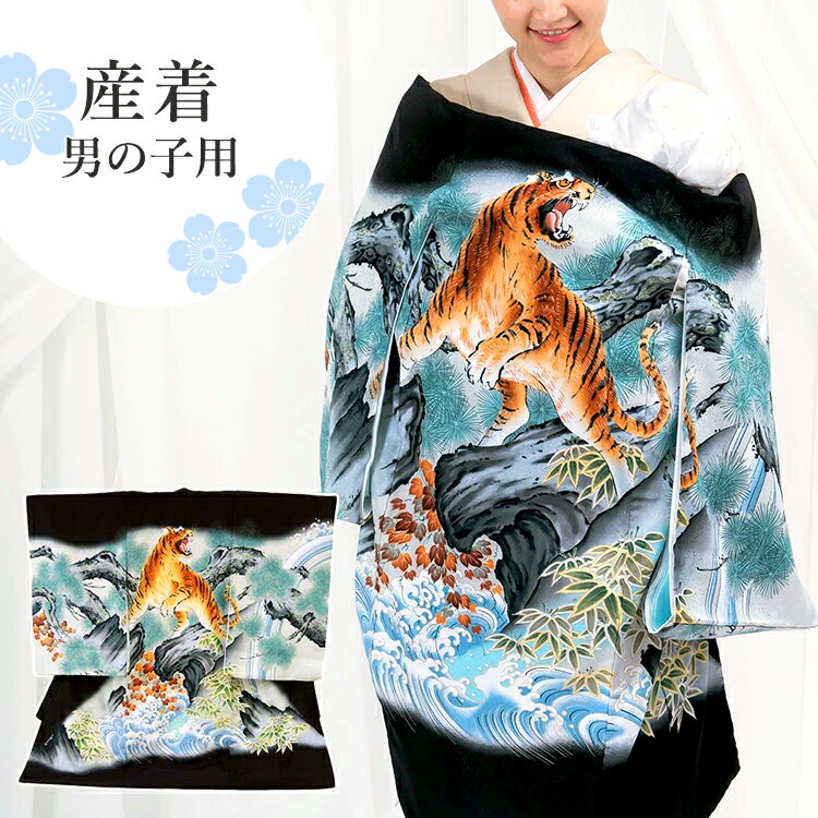 お宮参り 着物 男の子[虎と松 黒色] 産着セット(紐付きの着物+長襦袢) 着せ方マニュアル付き お宮参り 着物 男の子 HAL