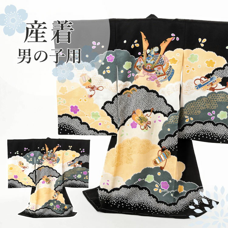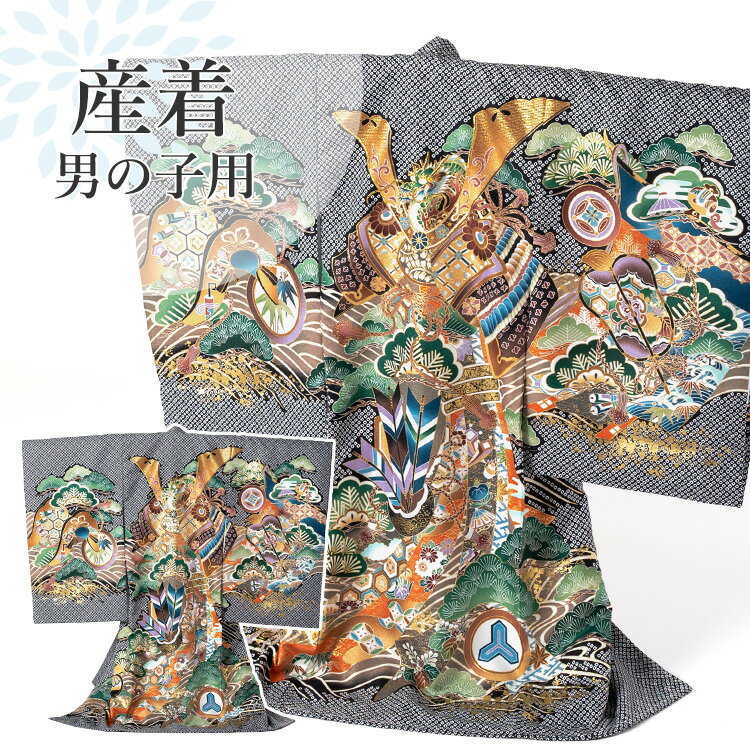お宮参り 着物 男の子[黒疋田 兜 鷹] 産着セット(紐付きの着物+長襦袢) 着せ方マニュアル付き お宮参り 着物 男の子 HAL-v