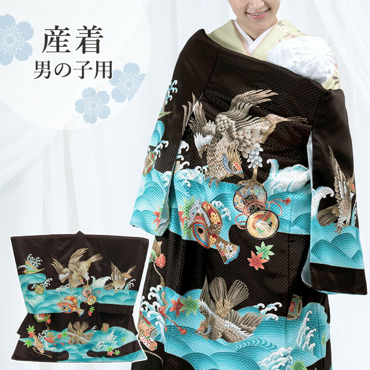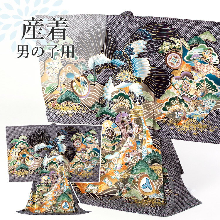 お宮参り 着物 男の子[黒疋田 鷹] 産着セット(紐付きの着物+長襦袢) 着せ方マニュアル付き お宮参り 着物 男の子 HAL-v