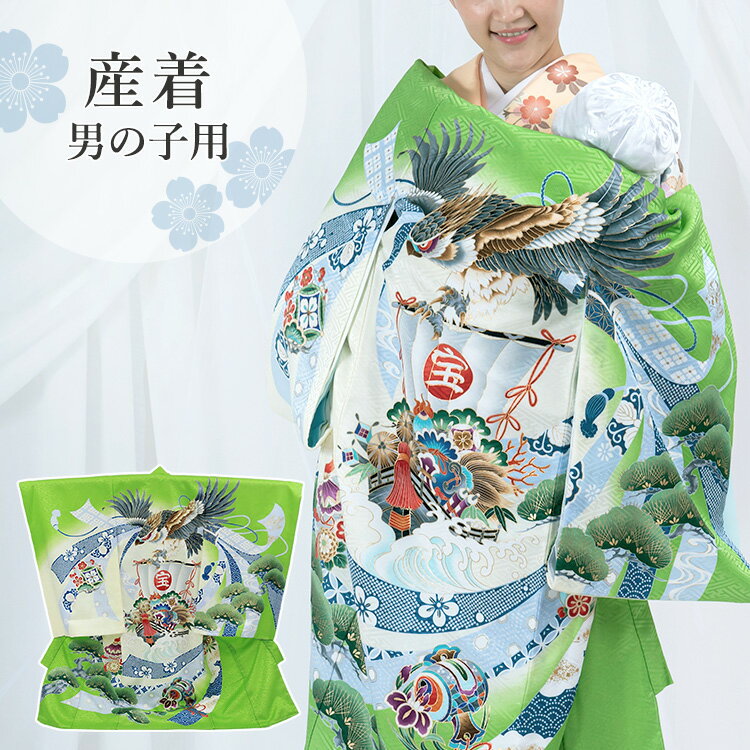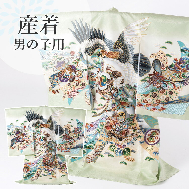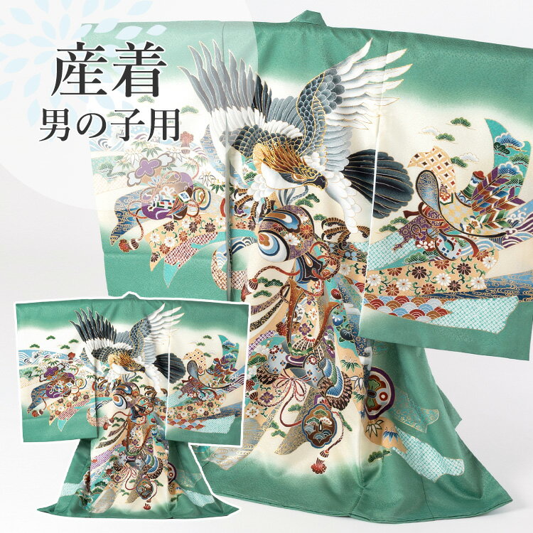 お宮参り 着物 男の子[青竹色 鷹] 産着セット(紐付きの着物+長襦袢) 着せ方マニュアル付き お宮参り 着物 男の子 HAL-v