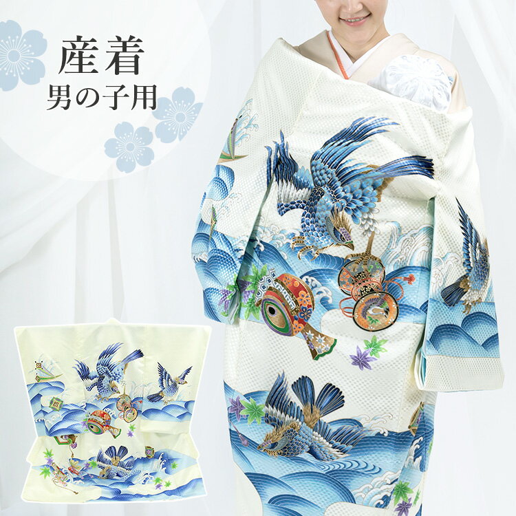お宮参り 着物 男の子[鷹に波 白色] 産着セット(紐付きの着物+長襦袢) 着せ方マニュアル付き お宮参り 着物 男の子 HAL