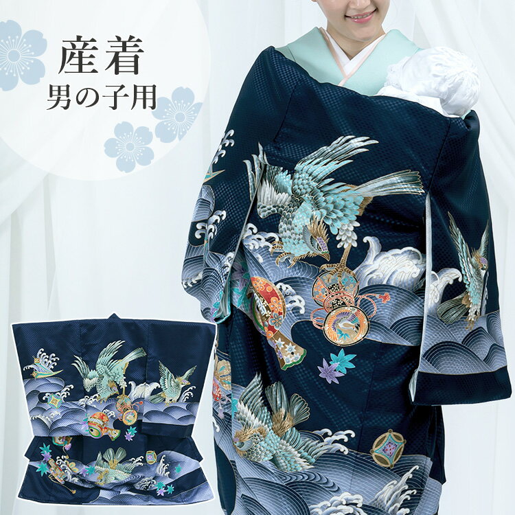 お宮参り 着物 男の子[鷹に波 紺色] 産着セット(紐付きの着物+長襦袢) 着せ方マニュアル付き お宮参り 着物 男の子 HAL