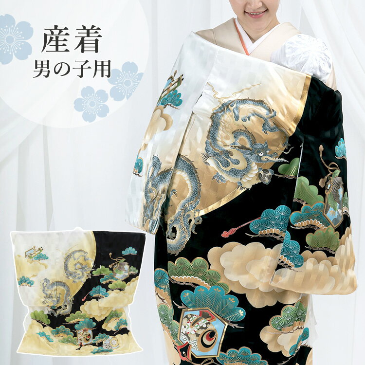 お宮参り 着物 男の子[龍に鼓 黒色] 産着セット(紐付きの着物+長襦袢) 着せ方マニュアル付き お宮参り 着物 男の子 HAL