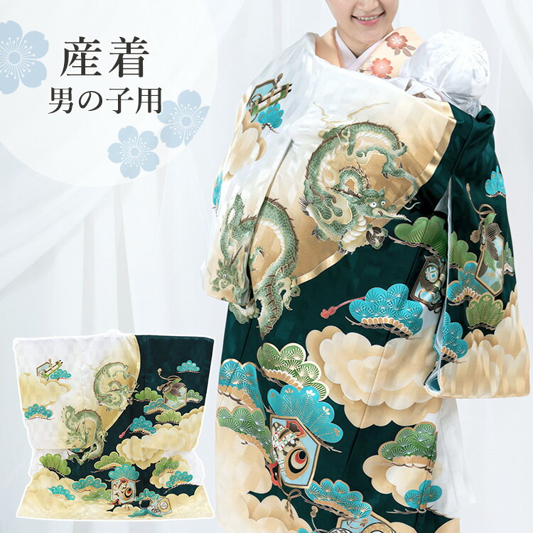 お宮参り 着物 男の子[龍と富士山 緑色] 産着セット(紐付きの着物+長襦袢) 着せ方マニュアル付き お宮参り 着物 男の子 HAL