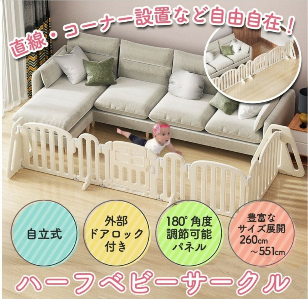 商品仕様〇サイズS(260cm)/M(357cm)/L(454cm)/XL(551cm)の4サイズ展開注意事項:ドアの色、ピンク 〇バリエーション4種類S/M/L/XLオフホワイト〇素材PE(ポリエチレン)〇重量約14kg(梱包時)〇セット内容本体〇お手入れ方法汚れが気になる場合はウエットティッシュなどで拭き取ってください。〇ご注意・組立て前に必ず商品説明書をお読みください。・寸法は個体により若干の誤差がある場合がございます。・ご使用のモニター環境により色味が若干異なる場合がございます。・パネル成形時に生じた黒い汚れや素材の削りカスが残っている場合があります。・組立て前にきれいな布等を使用し、取り除いてください。・バリがある場合は、カッターなどで取り除いてください。・商品の取り付けは必ず大人が行ってください。細かい部品が含まれますので、小さなお子様やペットがいるご家庭では十分ご注意ください。・付属品が多めに入っている場合がございます。予備として保管してください。・セット内容に不備がある場合、購入販売店までお問合せください。〇吸着シートについて・使用する際は、ご自宅の環境を確認してください。・ご自宅の床環境によって使用できないこともあります。(カーペット、絨毯など)・粘着力のあるシートのため、床を傷つける可能性があります。・経年変化により、粘着力が劣る可能性があります。商品説明【自由に形を変えられるハーフベビーサークル】各パネル約180°まで角度調節が可能なので、自由な形が簡単に作れるハーフサークル!お部屋の形に合わせてお好みの設置が出来ます。【スペースを拡張・縮小自由】パネルの枚数や組み合わせを変えることで赤ちゃんのエリアを拡張・縮小が自由に可能。無駄なスペースを節約できます◎また、4サイズから選べるので様々なお部屋の大きさに対応します。【セーフティ性へのこだわり】重さがあり倒れにくい設計の台座や、お子様の視界を遮り過ぎず手足が挟まりにくいパーテーション。ドアは外部ロック式なのでお子様一人の力では開けられないように作られています。【簡単設置】工具いらずの連結パーツで簡単組み立てが可能。パーテーションの両端に三角形サイドパネルを設置し、壁や家具に当たるようにセッティングします。【様々なシーンで活躍】プレイエリアとして、危険エリアへの侵入を防ぐ仕切りとして、ご兄弟やペットと一緒にお住まいの赤ちゃんのセーフティーエリアとして、お昼寝スペースとしてなど幅広いシーンで活躍。 指定された配送時間は承っておりません。【Henry Henry Store】