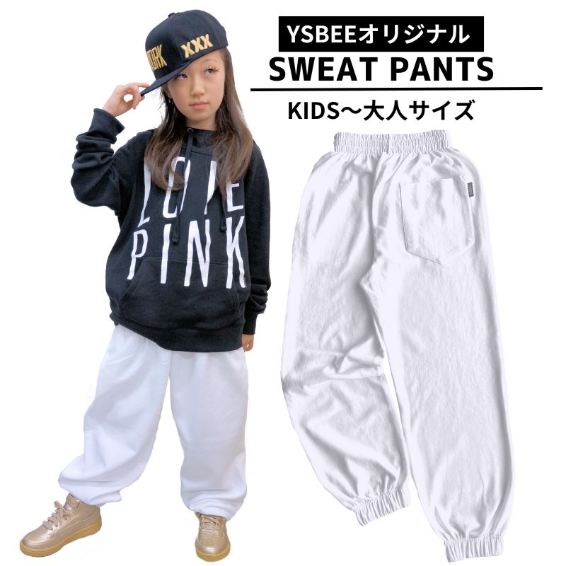 [ダンス衣装][ヒップホップ][キッズ ダンス衣装] 人気!!再入荷<YSBEEオリジナル>ダンススウェットパンツ ホワイトKIDS~大人サイズあり ダンス衣装・ダンスレッスン着・ヒップホップにコンテスト衣装・イベント・スポーツジムに人気のロングスウェットパンツ。無地だからコーディネートしやすくどんなジャンルでも対応出来ます。サイズはキッズから大人まで対応。オールシーズンOK。カッコいいラインではけるようにシルエットにもこだわり、キッズでもはきやすいように作っているスウェットパンツ。新しくポケットにビスネームがついてお洒落度UPしました。素材は上質な生地を使っていて、厚手過ぎず薄手過ぎず丈夫で長くはいていただけます。数々のダンスコンテスト衣装になっている、YSBEEオリジナルスウェットパンツとってもオススメです。 [商品詳細]●男女兼用●ウエストゴム入り・同色の紐付き●ポケット両脇・後ろ(右)3箇所ついています●足裾にはゴムを通せる小さい穴が開いています キッズなど緩い場合は床に引きずる心配もなく 調節出来るようになっています [素材]綿95% ポリエステル5%生地の透け感なし●裏起毛ではありません 裏地も表生地も同じなので履き心地抜群●上質な生地を使用の為、毛玉になりません。 膝も出にくい素材となっています。●生地を裁断しても糸が出ない為加工にもオススメ ダメージ風にハサミで裁断してもカッコイイ仕上がり [サイズ]キッズ、ジュニア、レディース対応サイズ※身長の目安は今までご購入されているお客様のサイズを参考にして ご提案させていただいております。体型などにより若干異なる場合も ありますので、あくまで参考サイズとなっております。 モデル着用画像も参考になさって下さい。※平置きで計測しております。サイズは測り方により多少の誤差はございます。ご了承の上、ご注文をよろしくお願いいたします。KIDSから大人までのサイズ展開!! カラーは人気のホワイト!!男女兼用!!◆サイズ目安◆ KIDSサイズ→3S(140cm)~2S(150cm)Jr・大人サイズ→S・M・L サイズの選び方として、下記を目安に身長に合わせてお選び下さい。細くタイトにはきたい場合は左のサイズ。ダボ感が欲しい場合は1サイズUPの右側がおススメです。