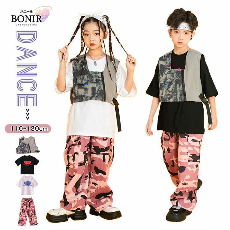 キッズ ダンス 衣装 ヒップホップ 子供服 男女兼用 チーム衣装 Tシャツ 半袖 迷彩パンツ ベスト ロングパンツ 女の子 男の子 ダンスウェア k-pop hiphop ジャズダンス 団体服 演出服 おしゃれ ステージ衣装 ストリート b系 原宿系 メンズ レディース DANCE 110~180