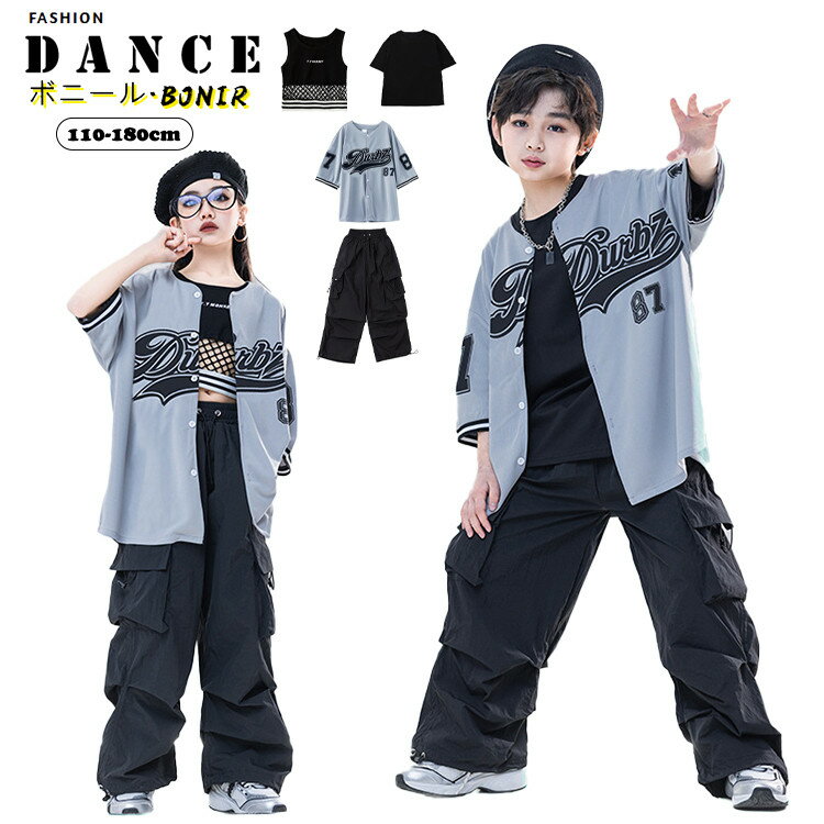 ダンス衣装 キッズ セットアップ ベースボール Tシャツ 半袖 ブラック 野球風シャツ ヒップホップ カーゴパンツ 男の子 女の子 男女兼用 チーム衣装 へそ出し レディース メンズ DANCE ステージ衣装 子供 ストリート 演出服 ダンスウェア ジュニア 110-180cm