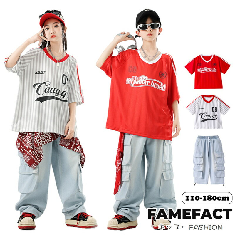 ダンス衣装 キッズ 女の子 男の子 レッド ホワイト 半袖 Tシャツ デニムパンツ ロングパンツ 子供服 セットアップ HIPHOP ヒップホップ 原宿系 ガールズ ジャッズ boys girls ジャッズ ストリート レディース メンズ DANCE ダンスウエア 原宿系 ダンスウェア 110-180cm