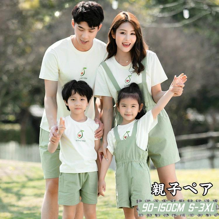 送料無料 親子ペア tシャツ オーバーオール 2点セット グリーン 白 緑 4人 2人 親子ペアルック ビーチ 親子2点セット ペアルック リンクコーデ 親