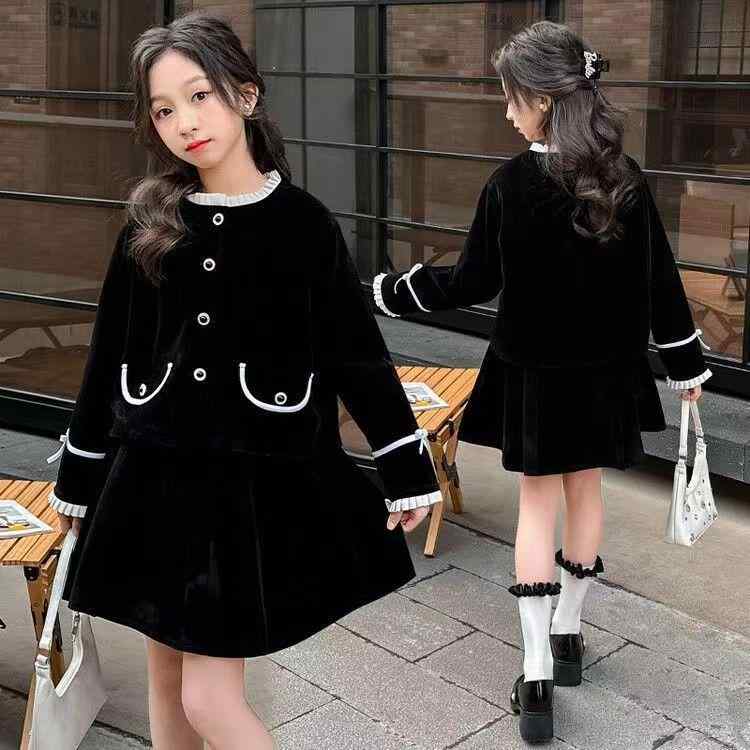 子供用セットアップ 女の子 春秋物 ジャケット 膝丈スカート 2点セット 中学生 小学生 ブラック フォーマル カジュアルスタイル・対象: 女の子・スタイル: 韓国風・セット内容: スカート、トップス(2点セット)・袖丈: 長袖・フード: なし・厚さ: 薄手・柄: その他・素材: 綿、ポリエステル・留め具: シングルブレスト・色: ブラック・サイズ: 120、130、140、150、160、170・カテゴリ: 子供用セットアップ