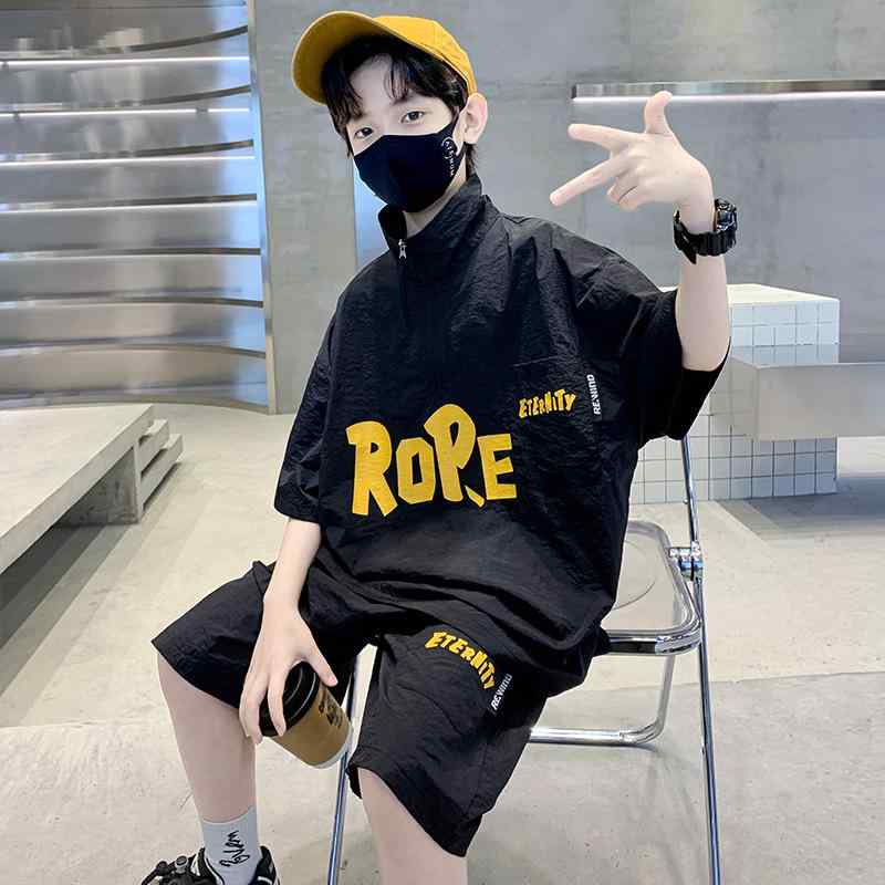 ・カテゴリ: キッズセットアップ・性別: 男児・対象年齢: 8歳以上・スタイル: スポーツ・タイプ: パンツセット・セット点数: 2点セット・袖丈: 半袖・パンツ丈: ショートパンツ・厚さ: 薄手・柄: アルファベットプリント・生地: 化学繊維混紡・主な素材: ポリエステル95%・生地加工: 柔らか加工・開閉タイプ: プルオーバー・カラー展開: ベージュ、ブラック・サイズ展開: 120cm, 130cm, 140cm, 150cm, 160cm, 170cm