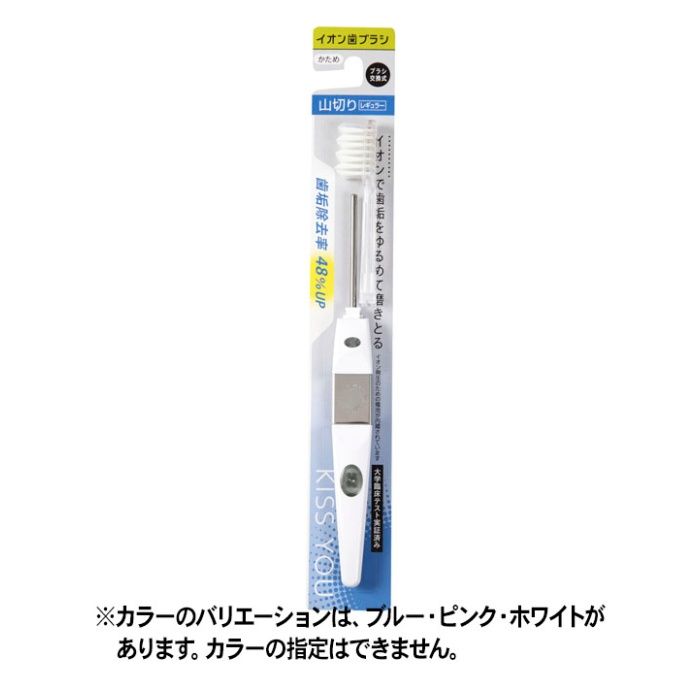 [特長]:■内蔵電池から微弱電流が流れマイナスイオンが発生。その効果で、歯磨き粉なしでもゴシゴシしなくても歯がつるつるに。■歯と歯の隙間にフィットする山切りカット。歯間の汚れをスッキリ落とす。■本体は1日3回15分磨いても1年以上使用できます。■ブラシは交換式で経済的。キスユー替えブラシはどれでも共用できます。[仕様]:■毛のかたさ:かため■ヘッドサイズ:山切りレギュラー■本体カラー:ブルー・ピンク・ホワイト ※色はお選びいただけません。[使い方]:■チェッカーボタンを押してランプが光れば残量OKです。■本体の柄の「金属板」に指または手のひらが触れるように握り、ブラッシングしてください。※電動ではありません。■「カチッ」 っと音がするまでしっかり差し込んで使用してください。※しっかりと差し込んでも簡単に外れる場合は本体(柄)側の接合部が磨耗している恐れがありますので本体を新品に交換してください。■交換時に外す場合はブラシヘッドをつかみやや強めに引き抜いてください。[注意事項]:■ブラシ交換の目処:1ヶ月を目安に交換してください。■KISS YOUのマイナスイオンは人体に安全ですが、ペースメーカー等をご使用の方は念の為医師に相談の上でご使用ください。■お子さまがご使用になる場合は、必ず大人の監督下で行ってください。