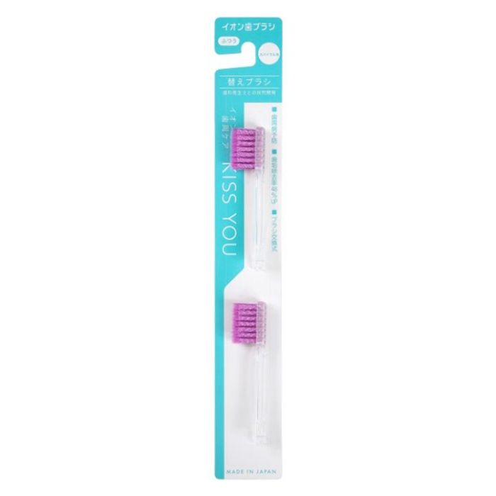 [特長]:■内蔵電池から流れるマイナスイオンの効果で歯磨き粉なしでもゴシゴシしなくても歯がつるつるになるイオン歯ブラシの替えヘッド。■歯周ポケットの奥まで届きサイドエッジがプラークを絡めとる。■スリムヘッドなので、狭い奥歯のところまで届く。[仕様]:■毛のかたさ:ふつう■ヘッドサイズ:極細スリムスパイラル■ブラシカラー:パープル[使い方]:■「カチッ」 っと音がするまでしっかり差し込んで使用してください。※しっかりと差し込んでも簡単に外れる場合は本体(柄)側の接合部が磨耗している恐れがありますので本体を新品に交換してください。■交換時に外す場合はブラシヘッドをつかみやや強めに引き抜いてください。[注意事項]:■ブラシ交換の目処:1ヶ月を目安に交換してください。■KISS YOUのマイナスイオンは人体に安全ですが、ペースメーカー等をご使用の方は念の為医師に相談の上でご使用ください。■お子さまがご使用になる場合は、必ず大人の監督下で行ってください。