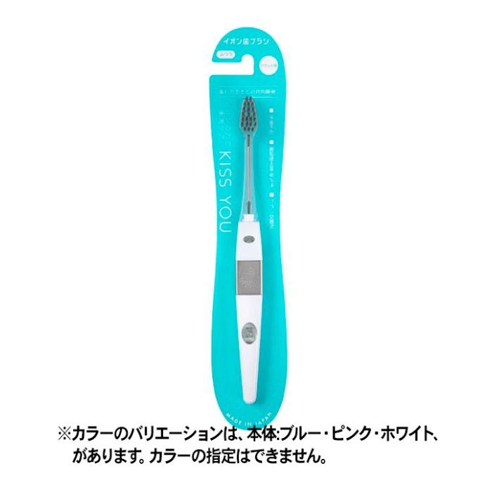 [特長]:■内蔵電池から微弱電流が流れマイナスイオンが発生。その効果で、歯磨き粉なしでもゴシゴシしなくても歯がつるつるに。■歯にあたる面積が大きいフラット毛が、効率的にプラークを除去する。■操作性の良いミディアムヘッド。■本体は1日3回15分磨いても1年以上使用できます。■ブラシは交換式で経済的。キスユー替えブラシはどれでも共用できます。[仕様]:■毛のかたさ:ふつう■ヘッドサイズ:フラットミディアム■本体カラー:ブルー・ピンク・ホワイト ※色はお選びいただけません。[使い方]:■チェッカーボタンを押してランプが光れば残量OKです。■本体の柄の「金属板」に指または手のひらが触れるように握り、ブラッシングしてください。※電動ではありません。■「カチッ」 っと音がするまでしっかり差し込んで使用してください。※しっかりと差し込んでも簡単に外れる場合は本体(柄)側の接合部が磨耗している恐れがありますので本体を新品に交換してください。■交換時に外す場合はブラシヘッドをつかみやや強めに引き抜いてください。[注意事項]:■ブラシ交換の目処:1ヶ月を目安に交換してください。■KISS YOUのマイナスイオンは人体に安全ですが、ペースメーカー等をご使用の方は念の為医師に相談の上でご使用ください。■お子さまがご使用になる場合は、必ず大人の監督下で行ってください。