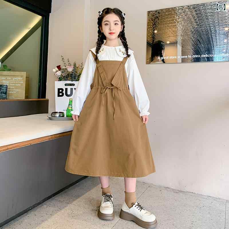ジャンパースカート 女の子 ワンピース 春秋 シンプル 韓国 Aライン かわいい ジャンスカ カーキ リボン カジュアル 普段使い セット 花 刺繍 シャツ