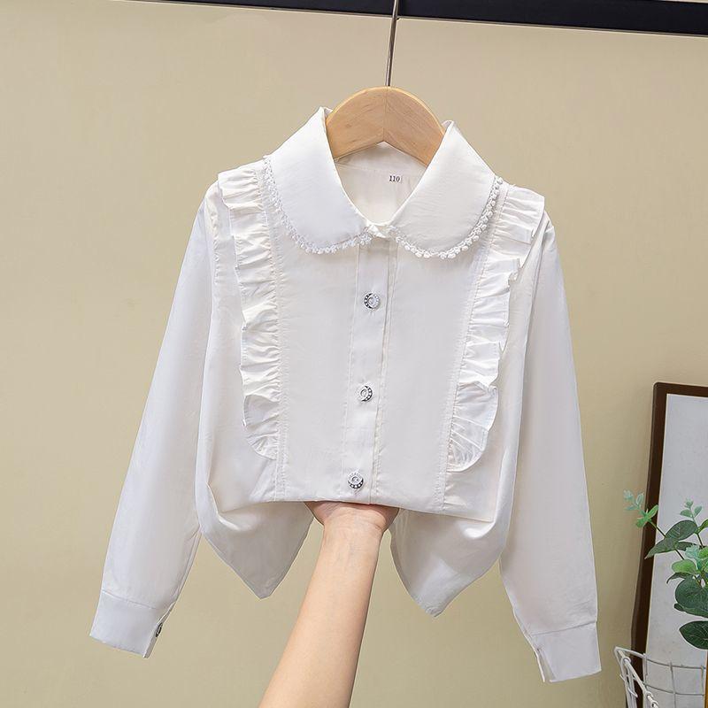 シャツ 女の子 春秋 スクール フリル 長袖 綿 小学生 通学 ポロ襟 かわいい おしゃれ 無地 柔らか ホワイト ジュニア