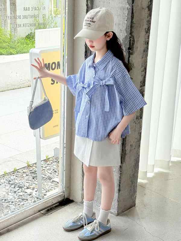 キッズ 女の子 セットアップ 半袖ブラウス キュロット ショートパンツ チェック柄 綿混 ポリエステル 薄手 柔らかい 春夏 カジュアル 普段着 お出かけ 上品 2点セット