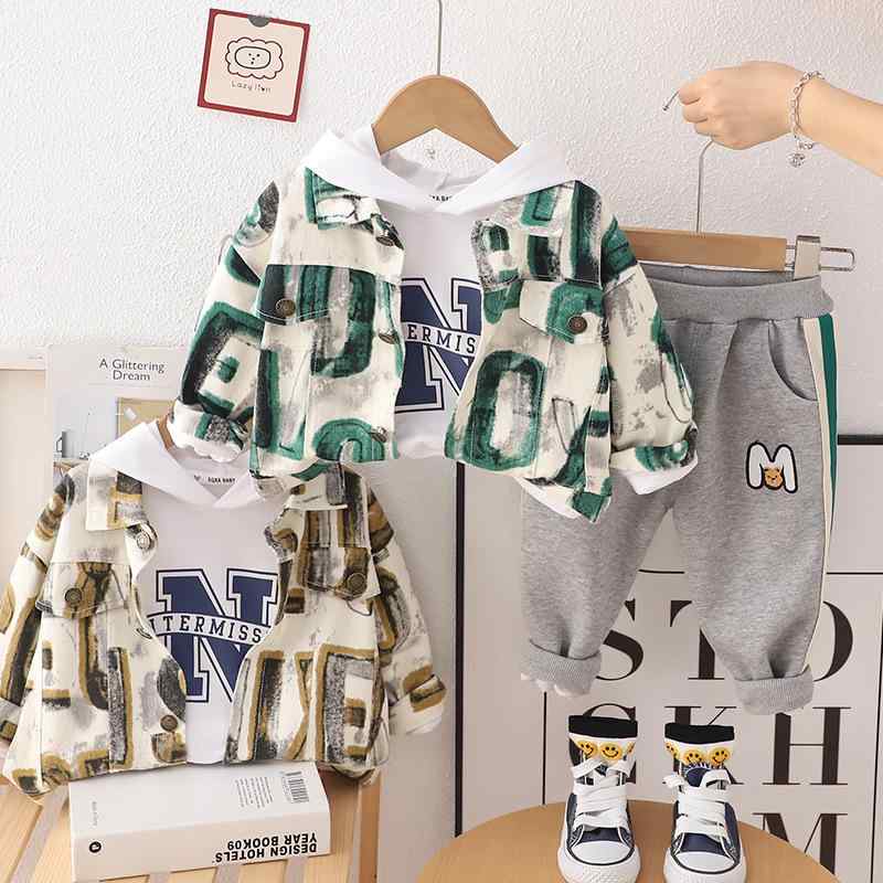 キッズ 男の子 ベビー 春秋 フード付き 総柄アルファベット 長袖 ジャケット アウター ロングパンツ 綿素材 ソフトタッチ おしゃれ カジュアル 3点セット セットアップ カーキ グリーン 80 90 100 110 120cm