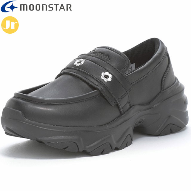 ムーンスター MOONSTAR ガールズシューズ ジュニア キッズ NI-MO NM J140 CHUNKY LOAFER ブラック ニーモ かわいく オシャレ スタイルアップ見せ シンプル ローファーデザイン Y2Kっぽい フラワースタッズ 抗菌防臭 洗えるインソール 2E シューズ 靴 12240396