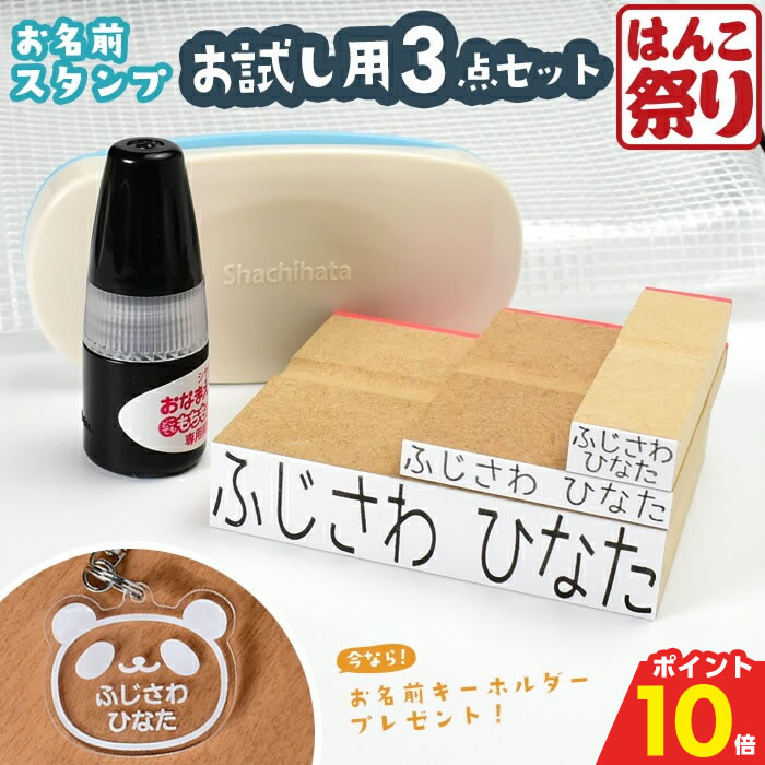 商品名お名前スタンプ お試し用(3点セット) セット内容 ・お名前スタンプ3個 ・収納クリアポーチ ・【おまけ】お名前キーホルダー ▼オプション選択で追加可 ・スタンプ台 ご購入時のご注意 ■この商品はご注文確認後5営業日以内の順次発送となります。(状況により出荷日が前後する事があります。) ■この商品はご注文後の内容変更及び他商品との同梱ができません。 ■お支払い・配送につきましては「お支払い・配送」のページをご覧下さい。 ■商品写真は出来る限り実物に近づくよう心がけておりますが、写真の撮影状況及びお使いのモニター環境等で現品と若干の差異がある場合がございます。予めご了承ください。また、イメージと違うといった理由での返品は受け付けておりませんのでご了承ください。 商品に不備があった場合での返品・交換に関しては「お支払い・配送」のページの返品についてをご覧ください。 ご挨拶 この度は当社印鑑サイト はんこ祭りのご利用誠に有難うございます。 送料無料や楽天企画もカバーしており法人印鑑・個人印鑑・子供用判子までオールインワン印鑑サイトです。お陰様で楽天ランキング印鑑ジャンルにも度々ランクインさせて頂いております。 (商品の性格上訳あり商品は取り扱いしておりません。) 【個人印鑑】では実印・銀行印・角印・認印【法人印鑑】会社印・社印セット・ゴム印・住所印・設立セットがございます。 【印材】柘・黒水牛・オランダ水牛・チタン・カラフル判子が全国送料無料のメール便や至急・お急ぎの場合の便利な あす楽にも対応しております。 チタン印鑑と印鑑ケース(はんこケース)のセットはギフトとしても人気です。 印鑑の他アンティークスタンプ、携帯ストラップなどの商品もご用意しております。商品ラインナップ 商品仕様 【お名前スタンプ】 サイズ:縦8 ~ 15mm / 横15 ~ 70mm ※商品ごとに変動 素 材:持ち手 / 木 印面 / 耐油性ゴム 【収納ポーチ】 サイズ:縦約15cm × 横約20cm素 材:PVC(ポリ塩化ビニル) 【お名前キーホルダー】 サイズ:本体 / 長辺約4.5cm 金属部分 / 約5.5cm 素 材:本体 / アクリル樹脂 金属部分 / 亜鉛合金、軟鋼線材(ニッケルメッキ) 【スタンプ台】 商品名:シヤチハタ おなまえスタンプ用インキセット カラー:ブラック 盤面サイズ:70 × 25mm 付属のインクをスタンプパッドに染み込ませてご使用ください ※注意事項※ ●お子様が使用される場合は必ず保護者の方が付き添ってください。 ●ご使用時は使用場所の換気をよくして下さい。 ●引火性のあるインキですので火気には十分お気をつけ下さい。 ●軟質塩ビへのスタンプには適しておりません。その他の材質によってもスタンプに適さないものがございますので、ご注意ください。 ●綿100%の布でも、生地の織り方によっては、スタンプしても色がのらない場合があります。 ●直接口をつける場所へのご使用はお避け下さい。 ●なるべく冷暗所で、お子様の手の届かないところに保管してください。 ●万一インキが多量に皮膚に付着した場合は、体質により影響を受ける場合がありますので、すぐに石鹼で洗ってください。特に顔面や眼球・傷口に付着した場合は、早急に医師の診断を受けて下さい。 ※付属品の仕様は予告なしに変更する場合がございますのであらかじめご了承ください。