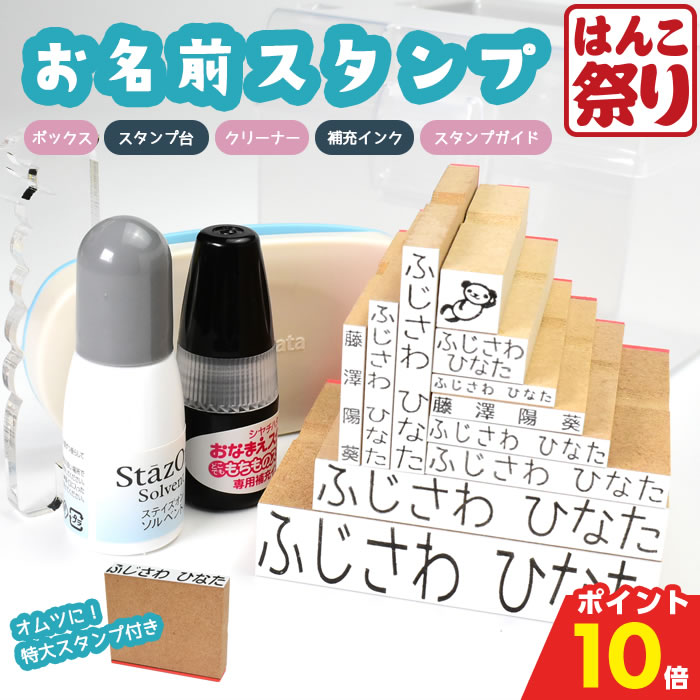 商品名お名前スタンプセット セット内容 ・お名前スタンプ11個 ・お名前スタンプ専用スタンプ台 ・インククリーナー ・アルパカスタンプガイド ・説明書 ・収納ボックス ご購入時のご注意 ■この商品はご注文確認後5営業日以内の順次発送となります。(状況により出荷日が前後する事があります。) ■この商品はご注文後の内容変更及び他商品との同梱ができません。 ■お支払い・配送につきましては「お支払い・配送」のページをご覧下さい。 ■商品写真は出来る限り実物に近づくよう心がけておりますが、写真の撮影状況及びお使いのモニター環境等で現品と若干の差異がある場合がございます。予めご了承ください。また、イメージと違うといった理由での返品は受け付けておりませんのでご了承ください。 商品に不備があった場合での返品・交換に関しては「お支払い・配送」のページの返品についてをご覧ください。 ご挨拶 この度は当社印鑑サイト はんこ祭りのご利用誠に有難うございます。 送料無料や楽天企画もカバーしており法人印鑑・個人印鑑・子供用判子までオールインワン印鑑サイトです。お陰様で楽天ランキング印鑑ジャンルにも度々ランクインさせて頂いております。 (商品の性格上訳あり商品は取り扱いしておりません。) 【個人印鑑】では実印・銀行印・角印・認印【法人印鑑】会社印・社印セット・ゴム印・住所印・設立セットがございます。 【印材】柘・黒水牛・オランダ水牛・チタン・カラフル判子が全国送料無料のメール便や至急・お急ぎの場合の便利な あす楽にも対応しております。 チタン印鑑と印鑑ケース(はんこケース)のセットはギフトとしても人気です。 印鑑の他アンティークスタンプ、携帯ストラップなどの商品もご用意しております。商品ラインナップ 商品仕様 【お名前スタンプ】 サイズ:縦3 ~ 40mm / 横4 ~ 70mm ※商品ごとに変動 素 材:持ち手 / 木 印面 / 耐油性ゴム 【アルパカガイド】 サイズ(外寸):約 縦75 × 横55 mm素 材:アクリル 【収納ボックス(紙ボックス)】 サイズ(外寸):約 縦65 × 横105 × 奥行80 mm素 材:紙 【収納ボックス(プラスチックボックス)】 サイズ(外寸):約 縦85 × 横108 × 奥行85 mm素 材:プラスチック 【スタンプ台】 商品名:シヤチハタ おなまえスタンプ用インキセット カラー:ブラック 盤面サイズ:70 × 25mm 付属のインクをスタンプパッドに染み込ませてご使用ください ※注意事項※ ●お子様が使用される場合は必ず保護者の方が付き添ってください。 ●ご使用時は使用場所の換気をよくして下さい。 ●引火性のあるインキですので火気には十分お気をつけ下さい。 ●軟質塩ビへのスタンプには適しておりません。その他の材質によってもスタンプに適さないものがございますので、ご注意ください。 ●綿100%の布でも、生地の織り方によっては、スタンプしても色がのらない場合があります。 ●直接口をつける場所へのご使用はお避け下さい。 ●なるべく冷暗所で、お子様の手の届かないところに保管してください。 ●万一インキが多量に皮膚に付着した場合は、体質により影響を受ける場合がありますので、すぐに石鹼で洗ってください。特に顔面や眼球・傷口に付着した場合は、早急に医師の診断を受けて下さい。 【クリーナー】 商品名:ステイズオンソルベント 内容量:10ml入り ※注意事項※ ●溶剤が含まれているため換気の良い場所でご使用下さい。 ●お子様の手の届かない場所に保存してください。 ●皮膚に付着した場合はすぐに洗浄してください。 ●眼・口に入った場合はすぐに大量の水で洗浄し、医師の診断を受けてください。 ※付属品の仕様は予告なしに変更する場合がございますのであらかじめご了承ください。