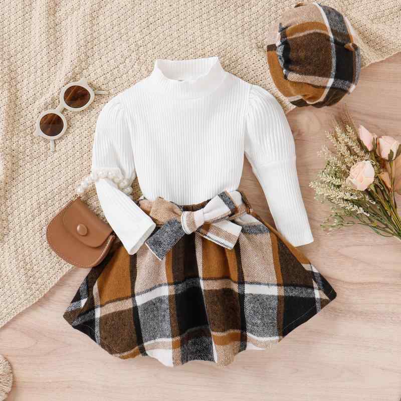 キッズ 女の子 ニット セットアップ 長袖トップス チェック柄 ミニスカート ベレー帽 秋冬 綿 3点セット 普段使い かわいい・適用性別: 女・スタイル: 欧美・套装タイプ: 裙套装・套装件数: 3点セット・礼盒内容: 服装+アクセサリー・適合年齢: 3~8歳 (100~140cm)・袖丈: 長袖・フード: 取り外し可能・生地加工: 柔らか обработка・厚さ: 普通・柄: 格子柄、無地・実写画像: モデルなし・在庫: 有・元素: セットアップ、格子柄、欧美・針数: 12~14針/3cm・生地: 綿・主な生地成分: 綿65%・安全レベル: B類・クロージャー: プルオーバー・カラー: ホワイト、ブラック・対応身長: 80cm, 90cm, 100cm, 110cm, 120cm・製品カテゴリ: 子供用セットアップ