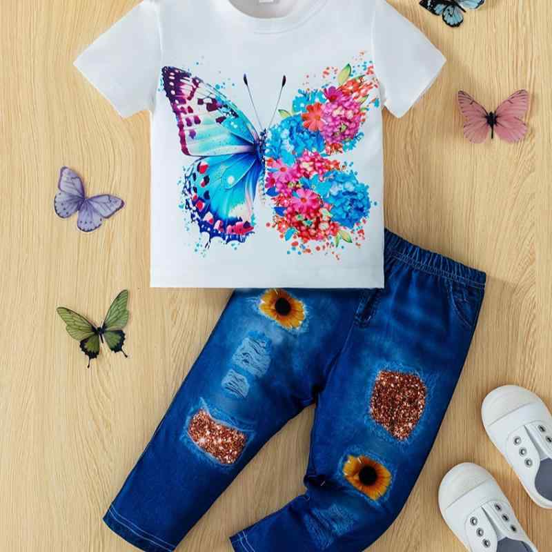 ベビー服 女の子 半袖トップス デニム風パンツ セットアップ 幼児 蝶 花柄 夏物 普段着