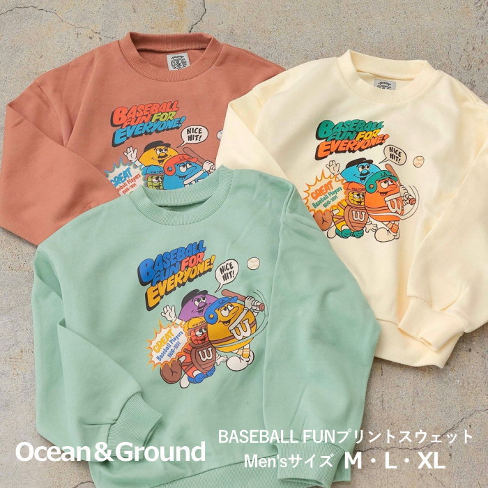 大人サイズ メンズ レディース トレーナー Ocean&Ground(オーシャンアンドグラウンド)Men's BASEBALL FUNプリントスウェット 綿100% M-XL | 子供 こども こども服 男児 女児 男の子 女の子 キッズ ジュニア トレーナー 長袖 綿100% 秋 冬 おしゃれ かわいい