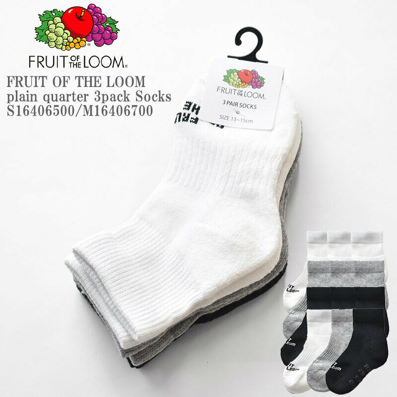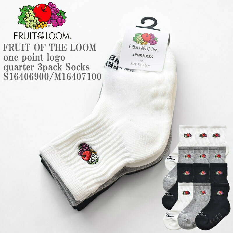 【KIDS】FRUIT OF THE LOOM フルーツ オブ ザ ルーム one point logo quarter 3pack Socks S16406900/M16407100 ワンポイント 刺繍 クォーター丈 スベル止め 底パイル 3足組 マルチ ロゴ ソックス 男児 女児