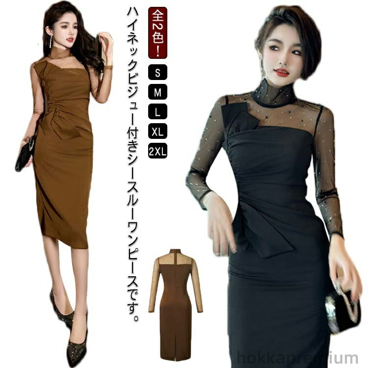 【送料無料】タイトワンピ オケージョン レディース 春 シースルー ハイネック 透け感 長袖 タイト パールビジュー キャバ ワンピース