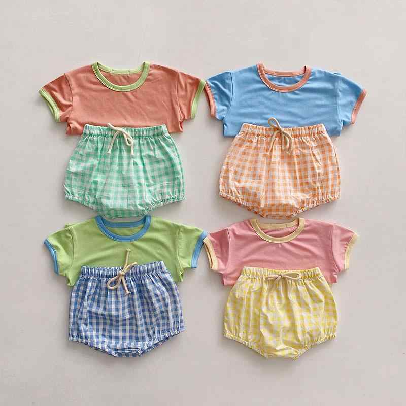 子供用セットアップ 春夏 格子柄 半袖トップス ショートパンツ ベビー服 男の子 女の子 70 80 90 100cm 綿100% かわいい パステルカラー 普段着 韓国風