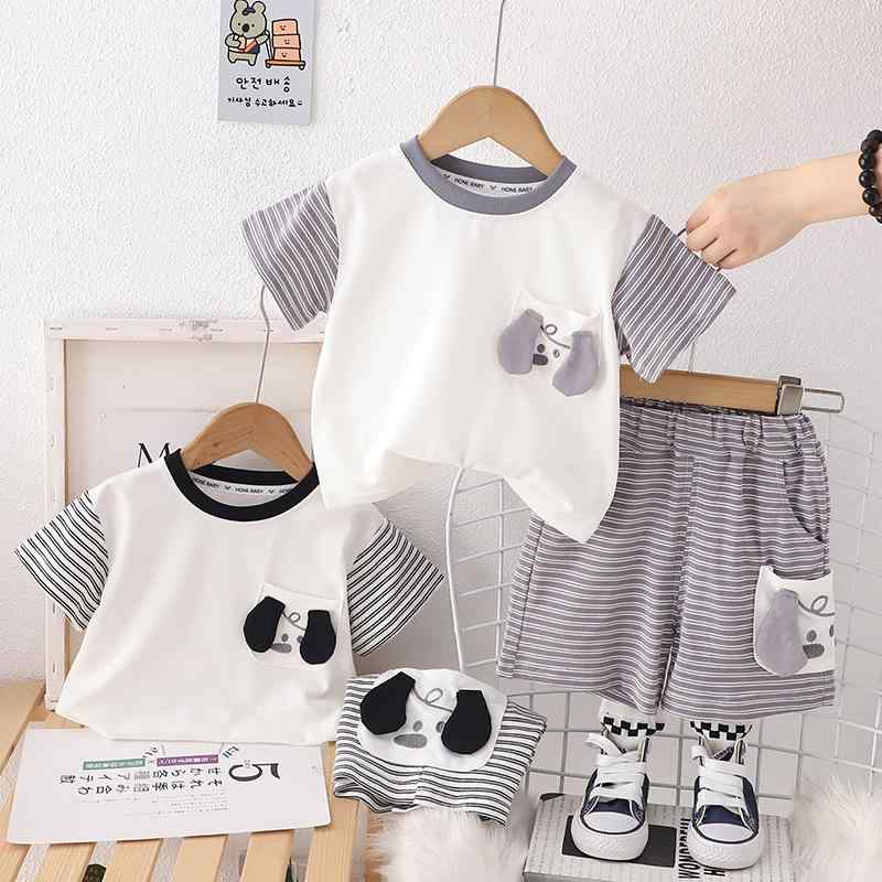 子供服 ベビー キッズ 幼児 ユニセックス 男の子 女の子 兼用 韓国風 カジュアル おしゃれ 半袖 ストライプ 犬柄 ショートパンツ パンツセット 2点セット セットアップ 薄手 綿 コットン 春夏