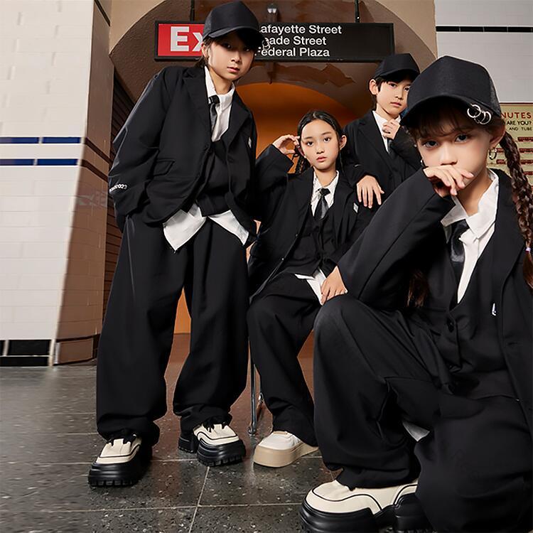 黒スーツセット キッズ ダンス衣装 キッズダンス フォーマル セットアップ 長袖 ゆったり ジャケット シャツ ベスト 男の子 女の子 小学生 中学生 入学式 卒業式 七五三 結婚式 韓国ファッション 演出服 舞台服 発表会 団体服 jazz ジャズダンス HIPHOP K-POP oversize