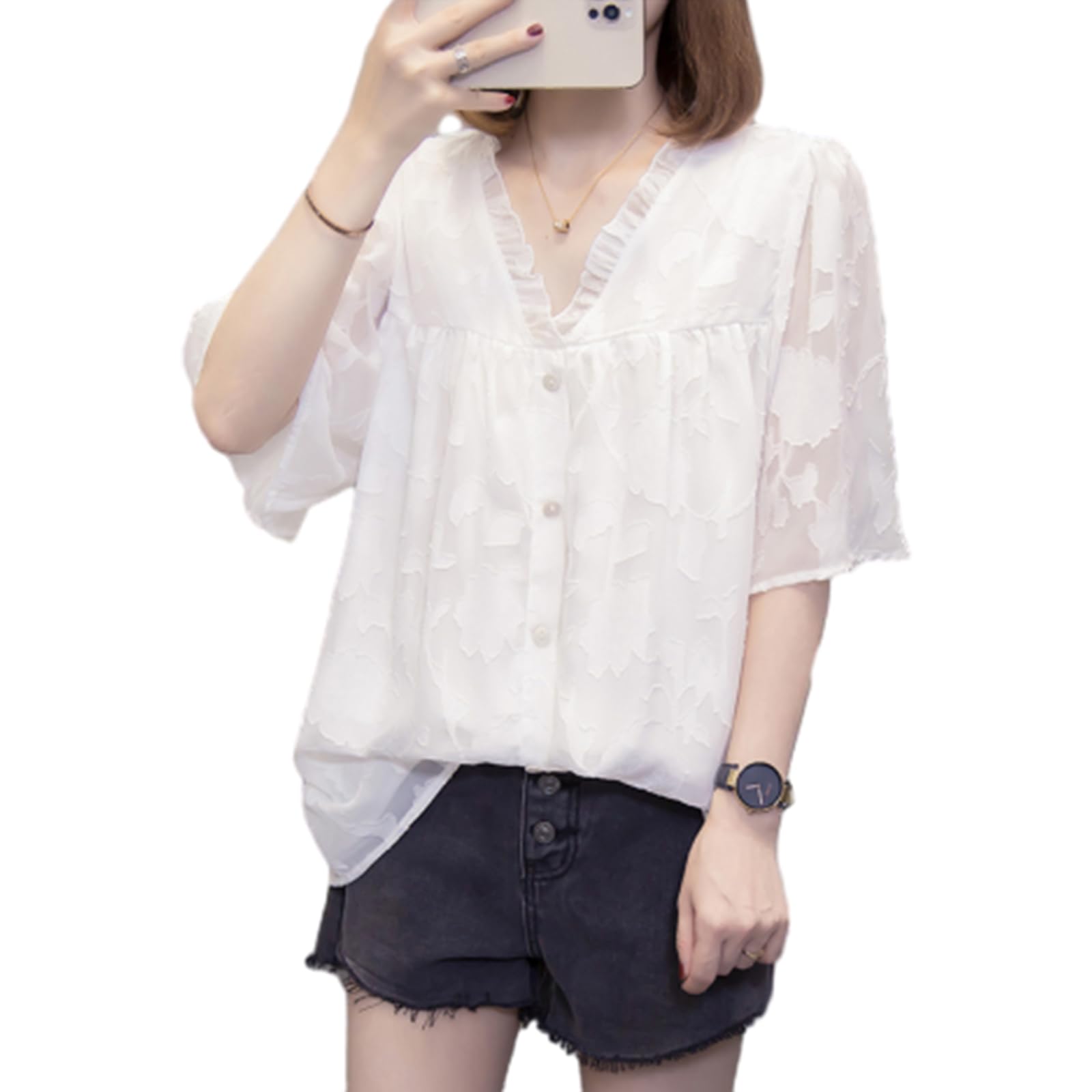 【送料無料】[CCGGOWMM] ブラウス レディース 半袖 Vネック Tシャツ 刺繍 花柄 ボタン装飾 トップス 夏シャツ エレガント 裏地付き 大きいサイズ 春服 おしゃれ お洒落 大人 着痩せ オフィス 通勤 OL きれいめ カジュアル 春夏