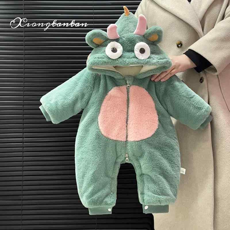 ベビー服 ロンパース 新生児 赤ちゃん 0歳 1歳 裏起毛 あったか 防寒 フード付き 長袖 カバーオール 恐竜 着ぐるみ かわいい 冬用 お出かけ着