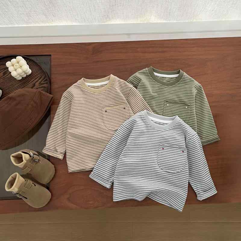 ・カテゴリ: キッズTシャツ・性別: 男性・対象年齢: 0〜3歳・スタイル: 韓国風・主な素材: 綿100%・生地加工: 柔軟加工・ネックライン: クルーネック・袖丈: 長袖・柄: ストライプ・特徴: トレンド要素・機能: 保温・カラー展開: ブルー、イエロー、グリーン・サイズ展開: 73, 80, 90, 100, 110