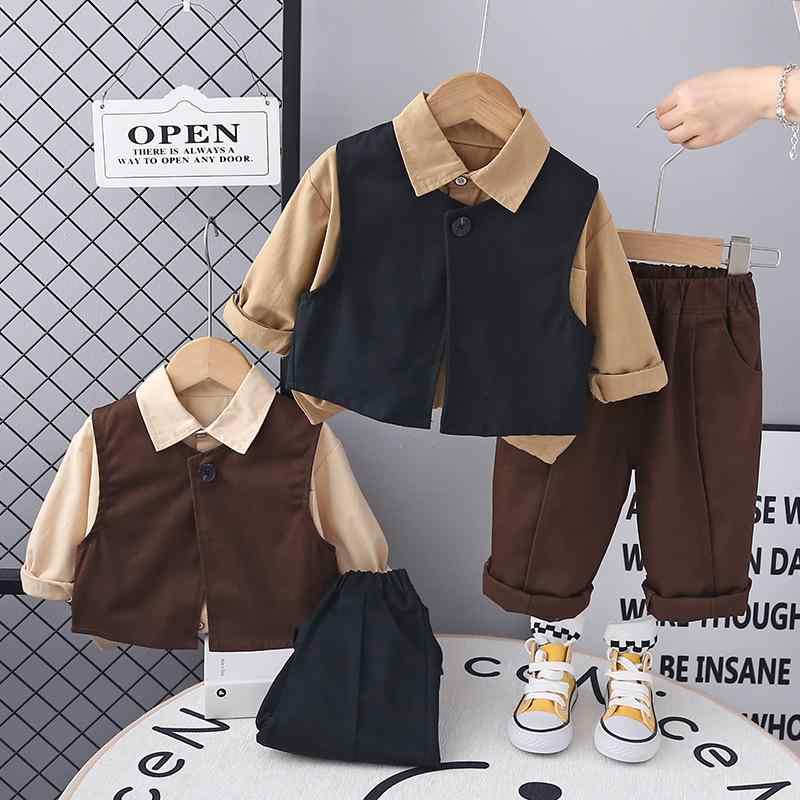 セットアップ 男の子 ベビー キッズ ベスト 3点セット 春秋物 カジュアル おしゃれ かっこいい 綿 コットン 柔らかい 長袖 ロングパンツ 無地 1歳 2歳 3歳 80cm 90cm 100cm