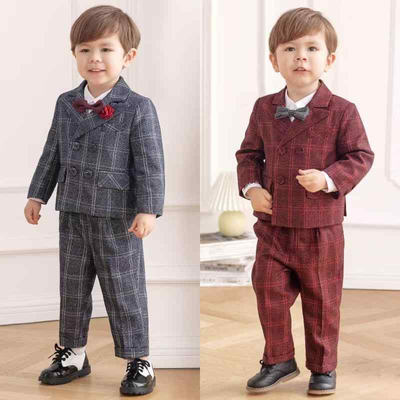 スーツ 男の子 キッズ 子供 裏起毛 暖かい 春秋冬 フォーマル 結婚式 発表会 花童 誕生日 入園式 卒園式 七五三 イギリス風 ブリティッシュ チェック柄 蝶ネクタイ 長袖 ダブルブレスト テーラードカラー ポリエステル セットアップ
