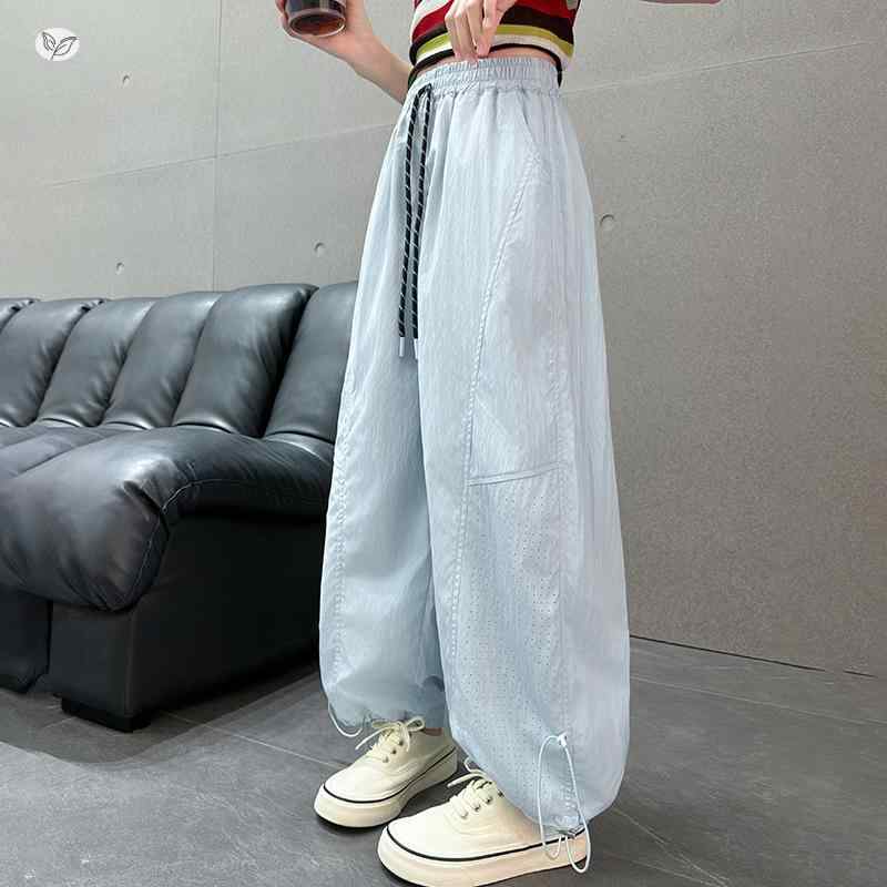 長ズボン 女児 中大童 夏 軽量 薄手 速乾 防蚊 メッシュ ウエスト紐 ワイド ルーズフィット ポリエステル素材 柔らかい 快適 普段使い 部屋着 カジュアル ハイウエスト 三色