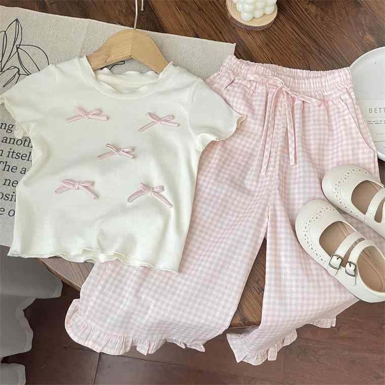 子供用パンツスーツ 女の子 夏物 半袖トップスと長ズボンの2点セット 90cm 100cm 110cm 120cm 130cm 140cm かわいい 幼児 小学生 普段着 部屋着 格子柄 蝶結び ピンク系