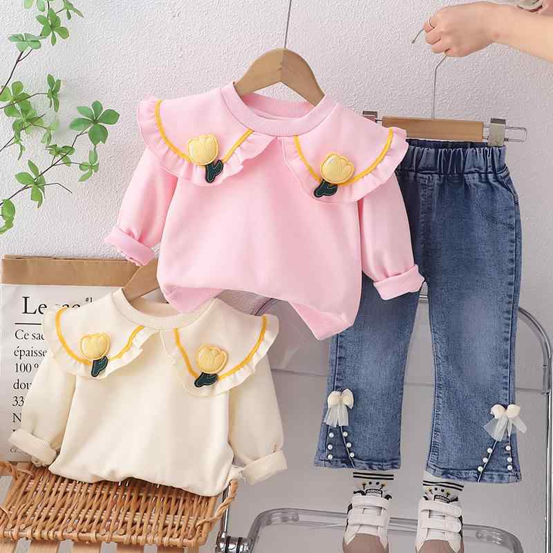ベビー服 女の子 付け襟 チューリップ柄 長袖 ブラウス ロングパンツ 上下セット コットン ソフトな肌触り カジュアル シンプル かわいい 春秋 ピンク アイボリー 普段使い