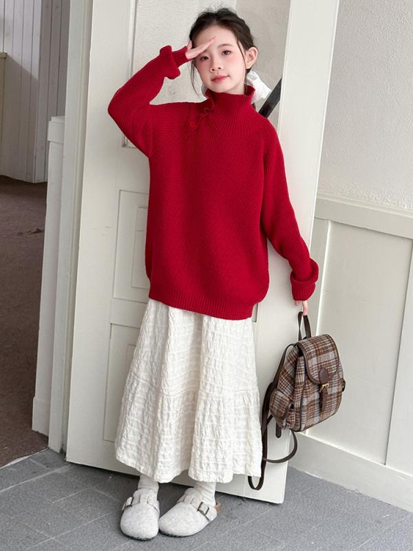 セーター 女の子 ガールズ ジュニア 秋冬 厚手 ニット プルオーバー 長袖 丸首 クルーネック アクリル 暖かい 保温 おしゃれ かわいい 着回し 万能 デイリー カジュアル レッド