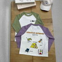 Tシャツ キッズ 春秋 アウトドア 長袖 カットソー 山系 キャンプ風 配色 切り替え カートゥーン柄 プリント 綿100% 吸湿性 通気性 デイリー 普段着 パープル グリーン